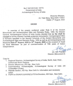 केंद्रीय संस्कृति मंत्री जी किशन रेड्डी ने एक ट्वीट में कहा कि आजादी का अमृत महोत्सव और 75वें स्वतंत्रता दिवस समारोह के हिस्से के रूप में ने 5 से 15 अगस्त 2022 तक देश भर में अपने सभी संरक्षित स्मारकों या स्थलों पर पर्यटकों के लिए प्रवेश निःशुल्क कर दिया है।